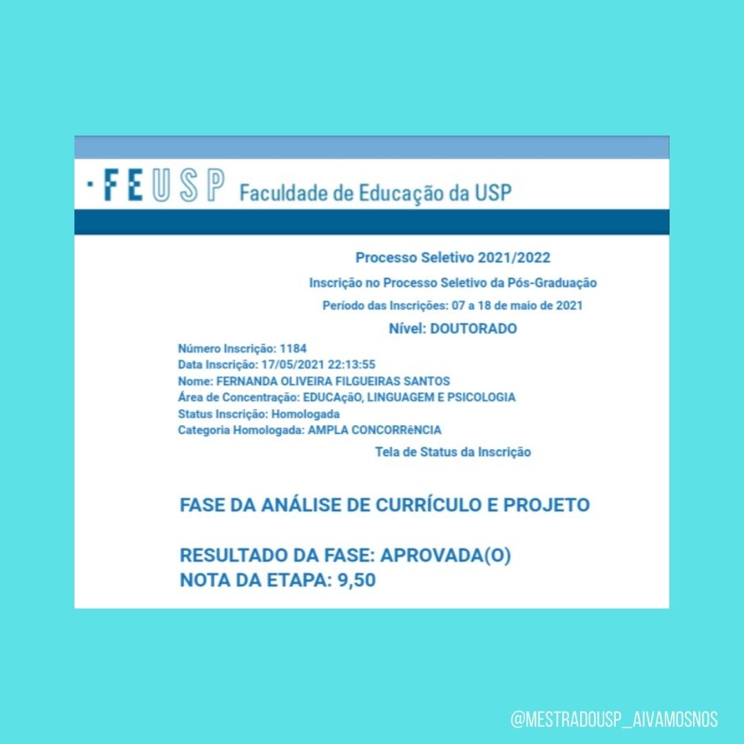 E vejam só: em 2011, estava comemorando minha aprovação no mestrado na USP e hoje, 10 anos depois, estou novamente experenciando essa mesma emoção, mas com a aprovação no doutorado!