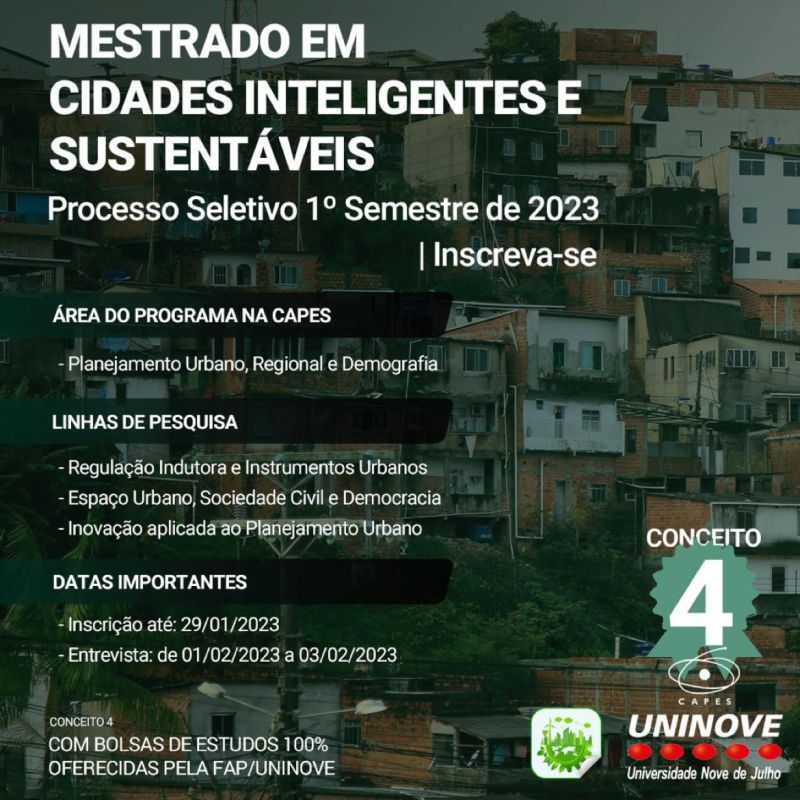 Estão abertas as inscrições para o processo seletivo do programa de pós-graduação em Cidades Inteligentes e Sustentáveis da UNINOVE para o primeiro semestre de 2023.